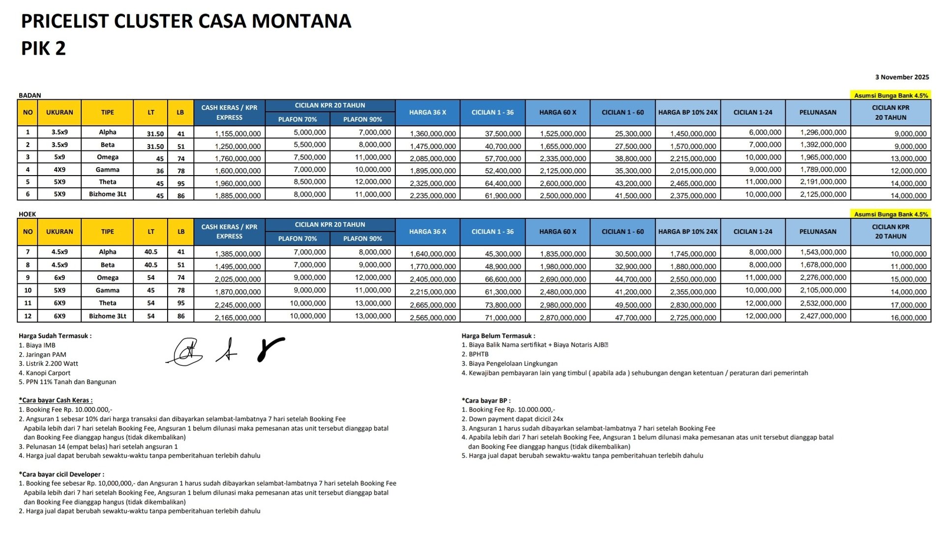 Pilihan ukuran unit mulai dari ~3,5 × 9 m hingga 5 × 9 m, dan terdapat cluster-sub bagian seperti “Casa Montana” yang merupakan bagian dari Casa Pasadena.