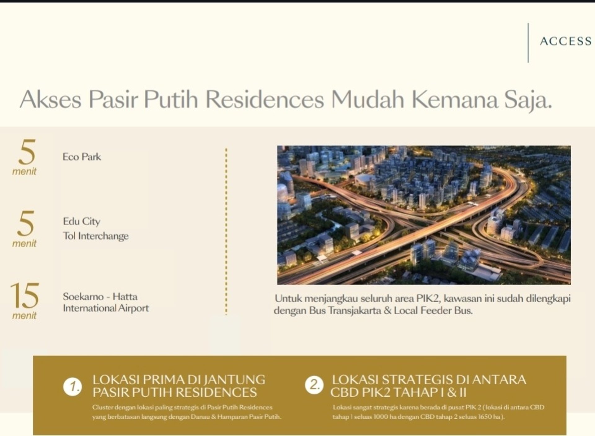 Kawasan terintegrasi: memiliki danau besar, pedestrian/jogging track, kawasan hijau, club house, akses ke fasilitas komersial dan bisnis di PIK 2.