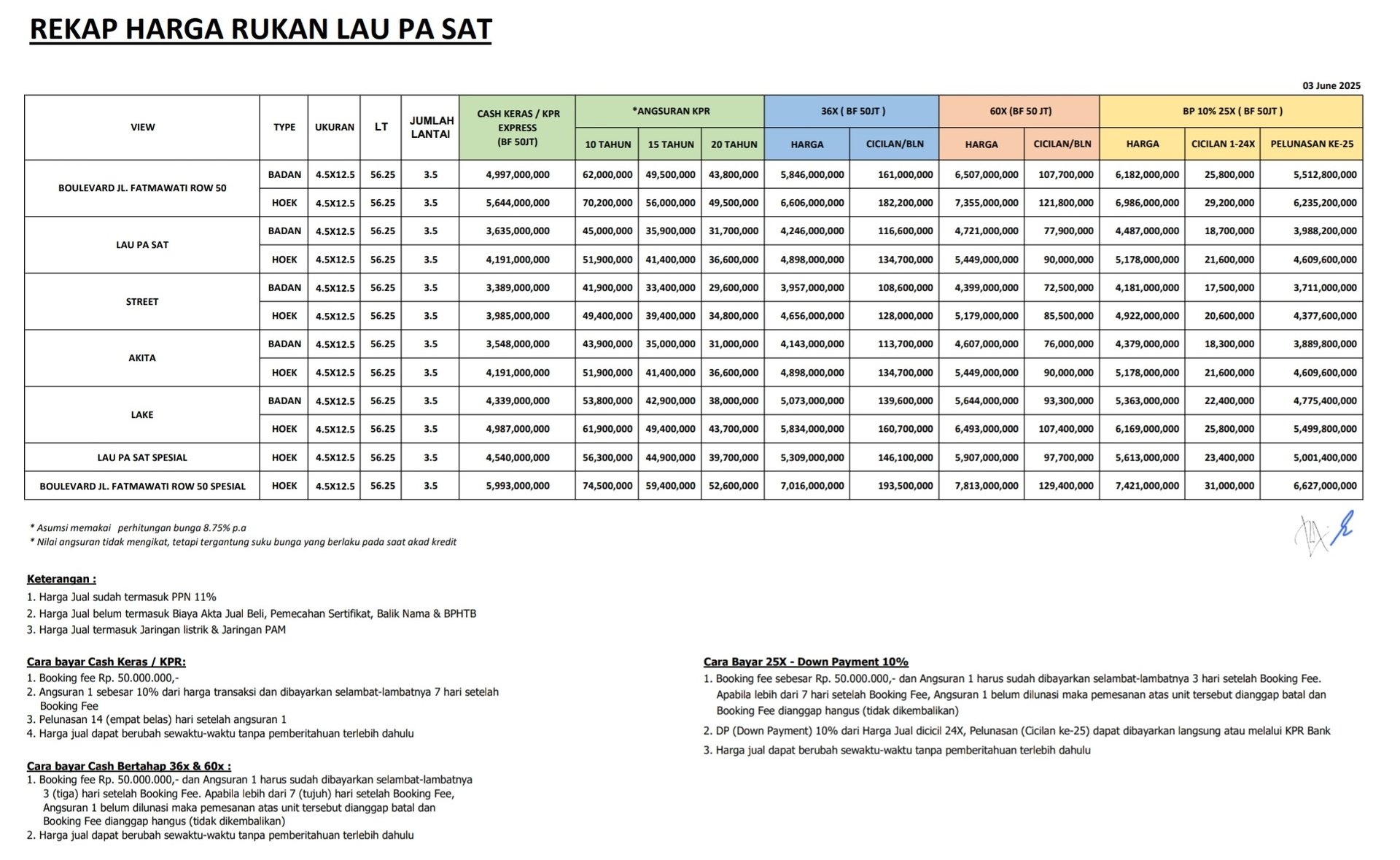 Contoh harga spesifik: view “Street” ukuran 4,5×12,5 dengan cash Rp 3,032 miliar.