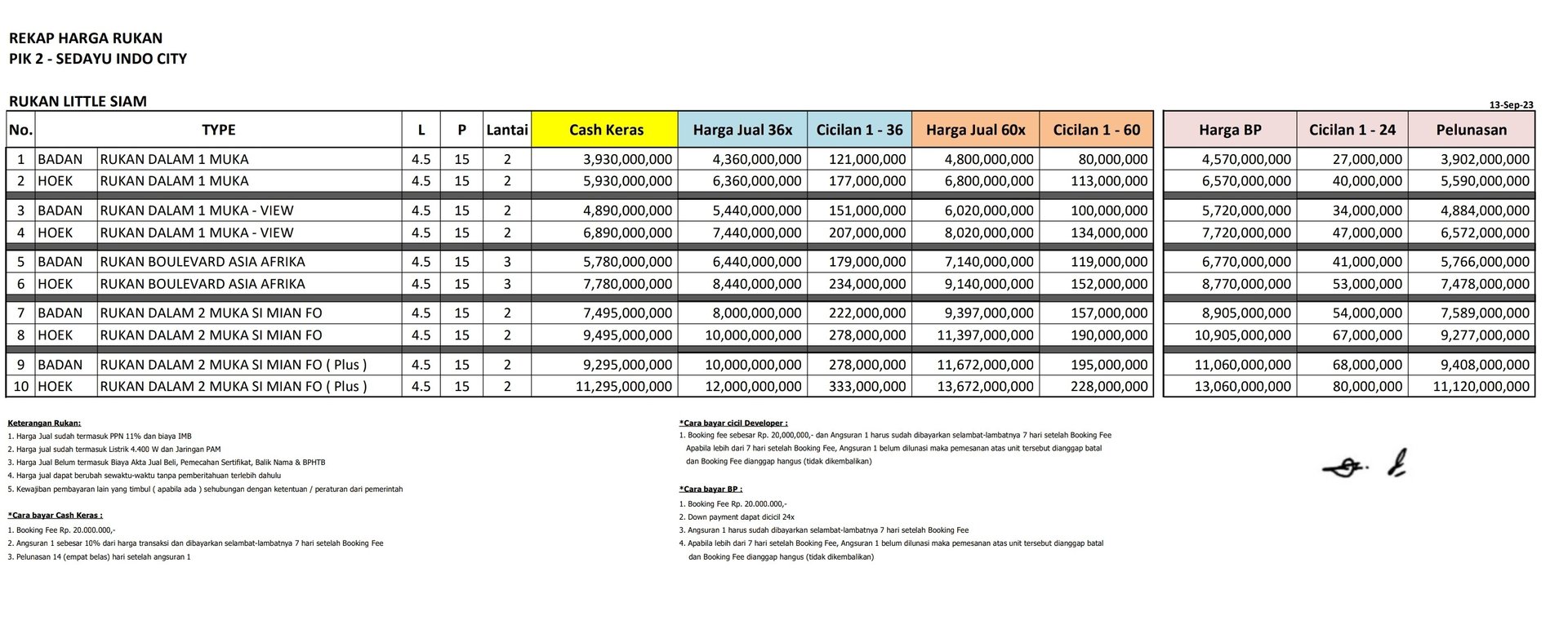 Unit ruko yang “hadap Si Mian Fo (2 muka)” harganya jauh lebih tinggi — contoh Rp 7,495 miliar (cash keras) untuk ukuran 4,5×15m 2 lantai.
