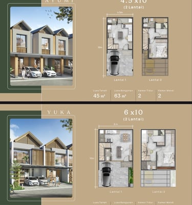 Tipe Yuri: LT ≈ 45 m² / LB ≈ 110 m² dengan 3 + 1 kamar tidur; 3 lantai.
