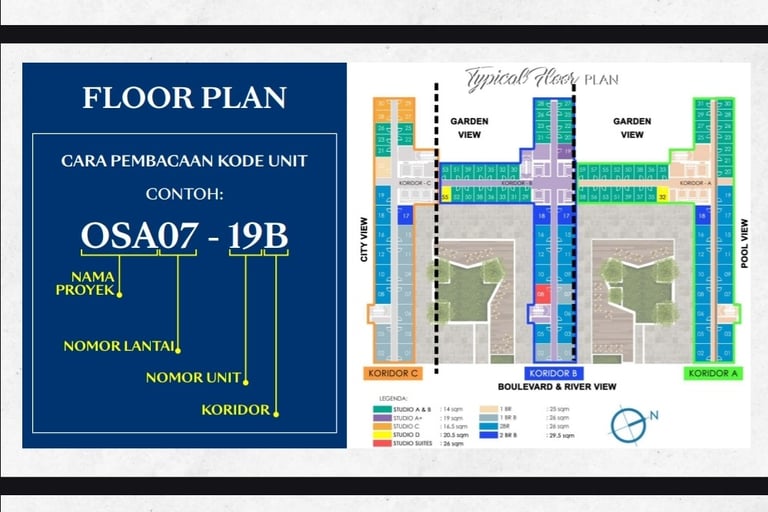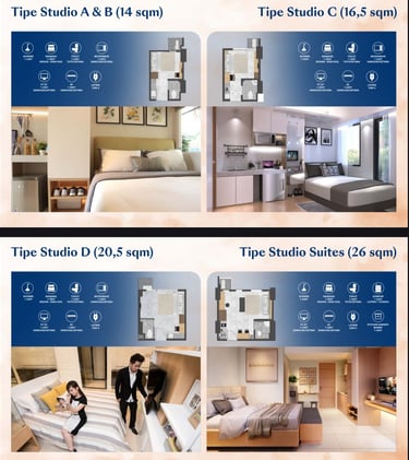 Ada unit studio berukuran kecil (mis: 14 m²) menurut listing.
