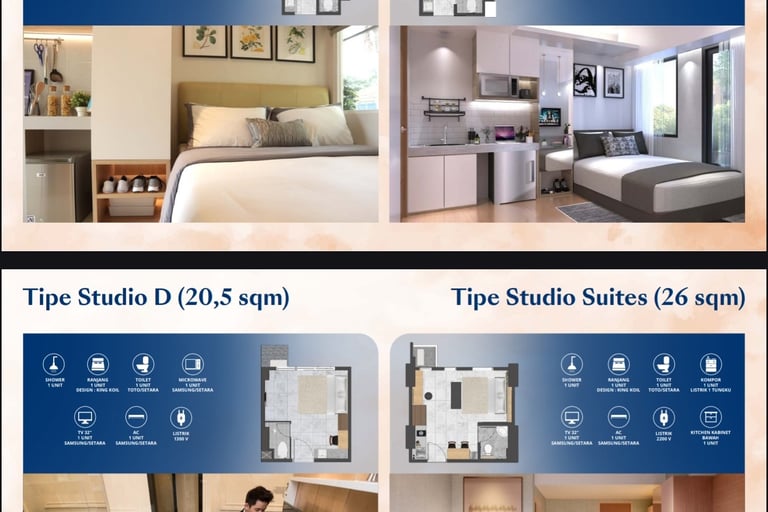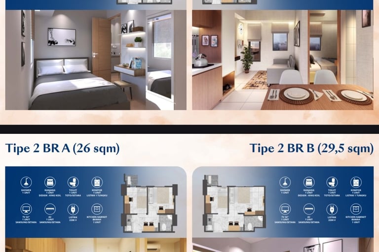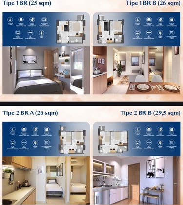 Ada juga tipe 2 BR (misalnya di salah satu iklan: 26 m² untuk 2 kamar).